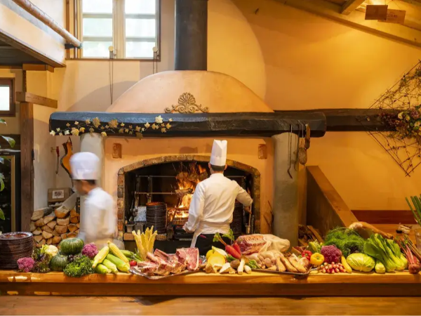 軽井沢の豊かな自然に包まれた「ピレネー」は、薪の火でじっくりと炙り焼きにするロティスリー料理を主軸に、地元野菜や日本海直送の鮮魚、自家農園の無農薬野菜など、四季折々の恵みを一皿に込めて提供する本格レストランです。